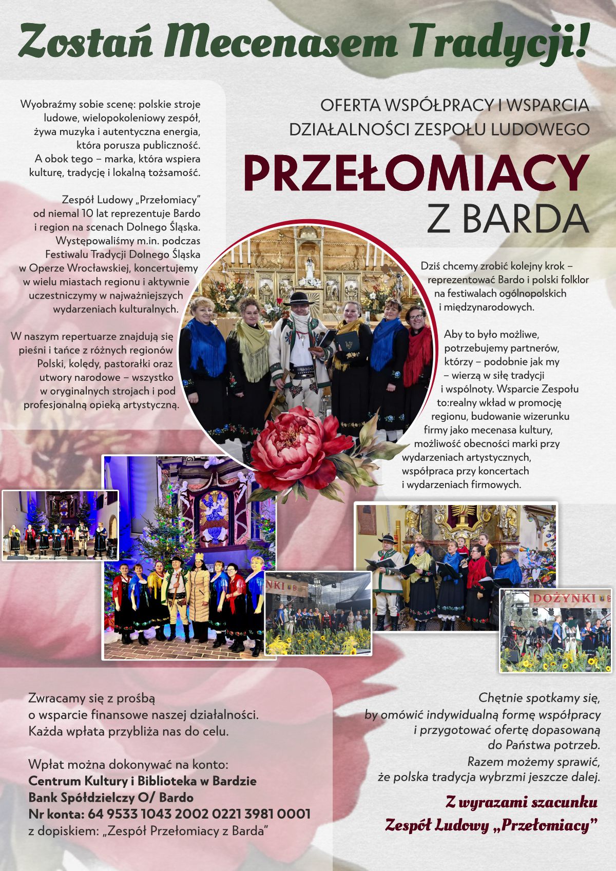 Dziś chcemy zrobić kolejny krok – reprezentować Bardo i polski folklor na festiwalach ogólnopolskich i międzynarodowych. Aby to było możliwe, potrzebujemy partnerów, którzy – podobnie jak my – wierzą w siłę tradycji i wspólnoty.