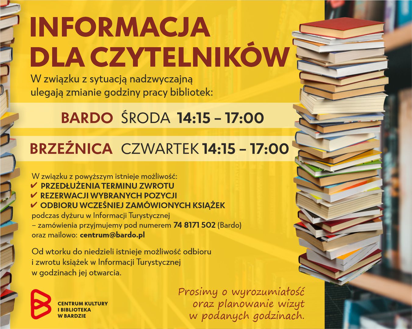 ✔ odbiorze wcześniej zamówionych książek podczas dyżuru w Informacji Turystycznej – zamówienia przyjmujemy pod numerem 74 8171 502 (biblioteka w Bardzie) oraz mailowo: centrum@bardo.pl.