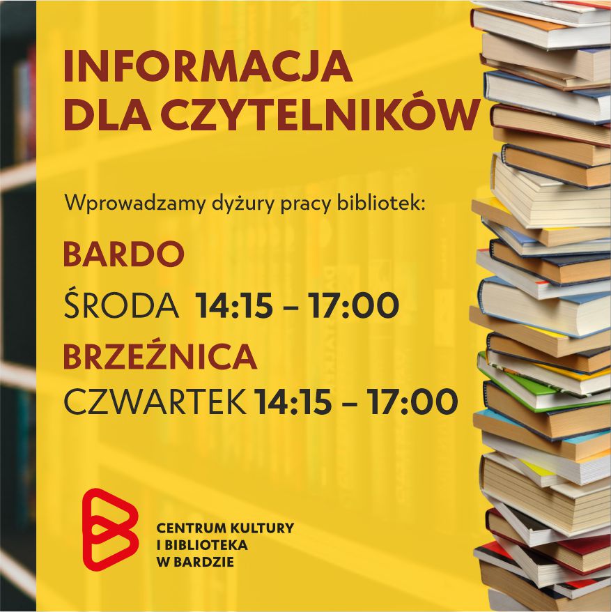 Drodzy Czytelnicy, ze względów organizacyjnych, wprowadzamy dyżury pracy bibliotek: